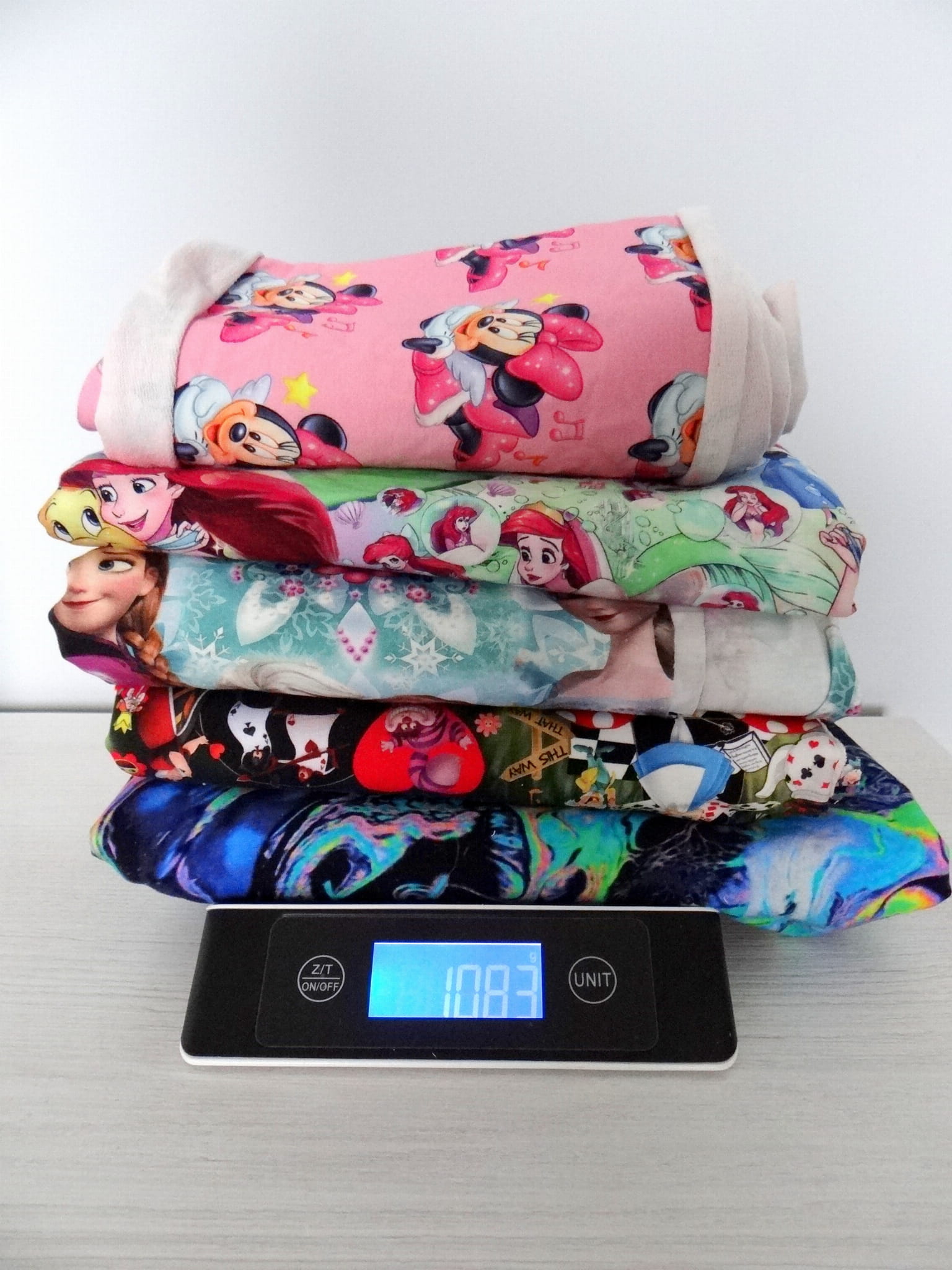 W zestawie można znaleźć różne wielkości kawałków, zazwyczaj idealne na czapeczki, kominy czasem też na większą odzież. Materiały to zawsze dresówki i jersey o nadruku cyfrowym.